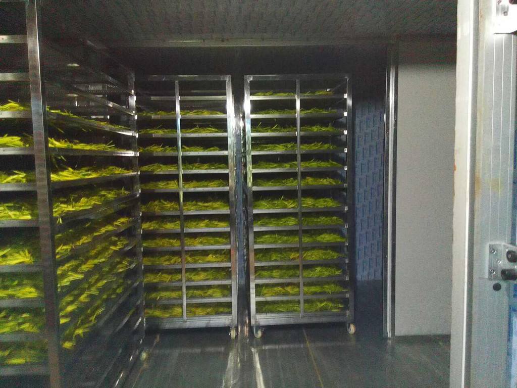 烘干工藝第三步:將高溫蒸煮后的黃花菜均勻鋪放到物料車內(nèi),注意厚度均勻,每層不超過(guò)3CM。